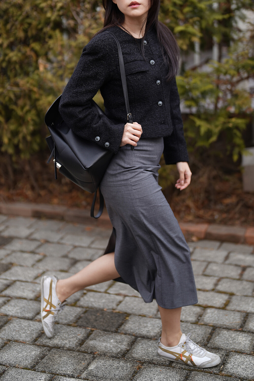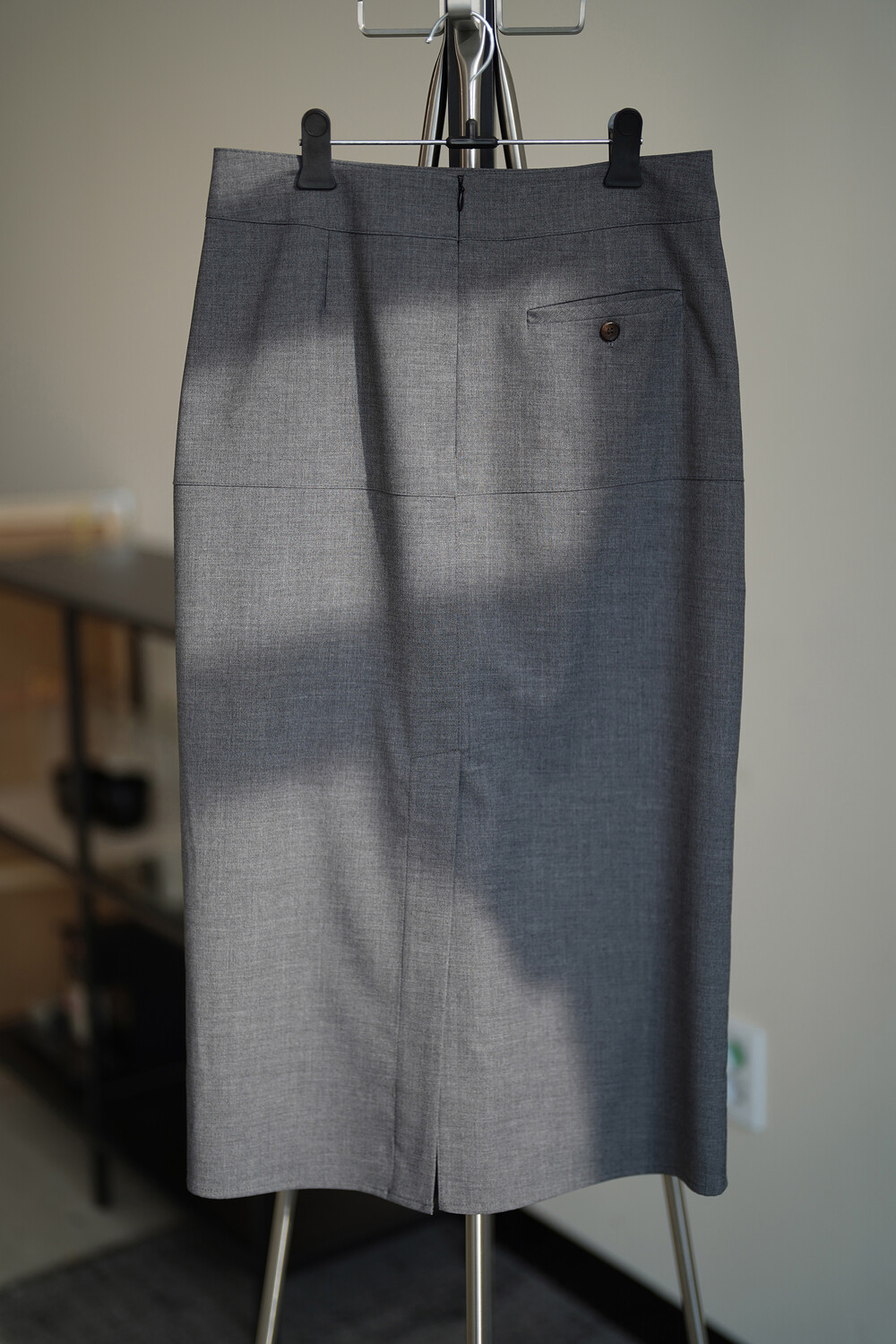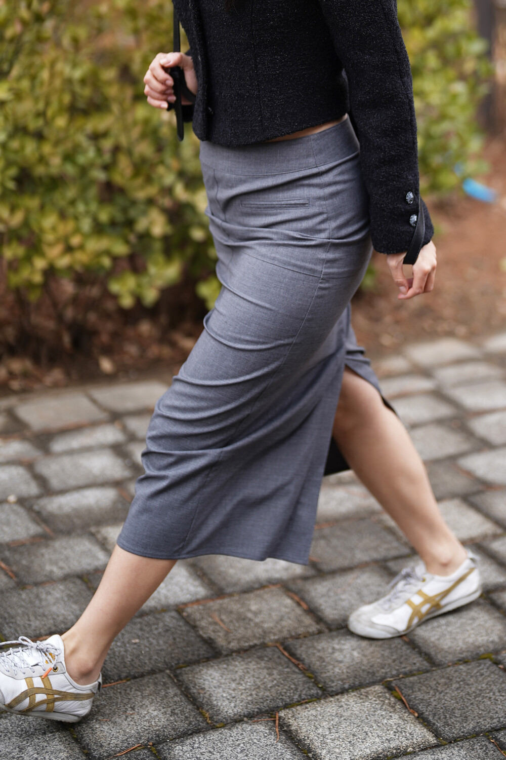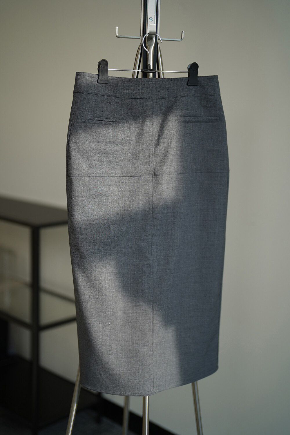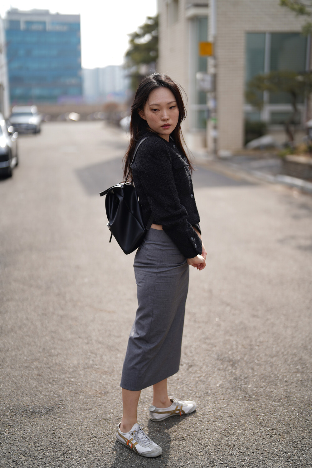 특히 박시한 티셔츠와 입으면, 슬림하게 내려오는 스커트와 대비되는 실루엣을